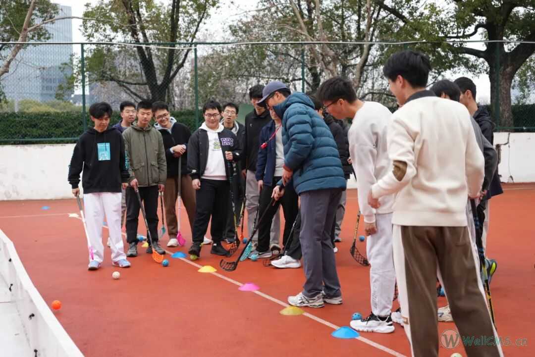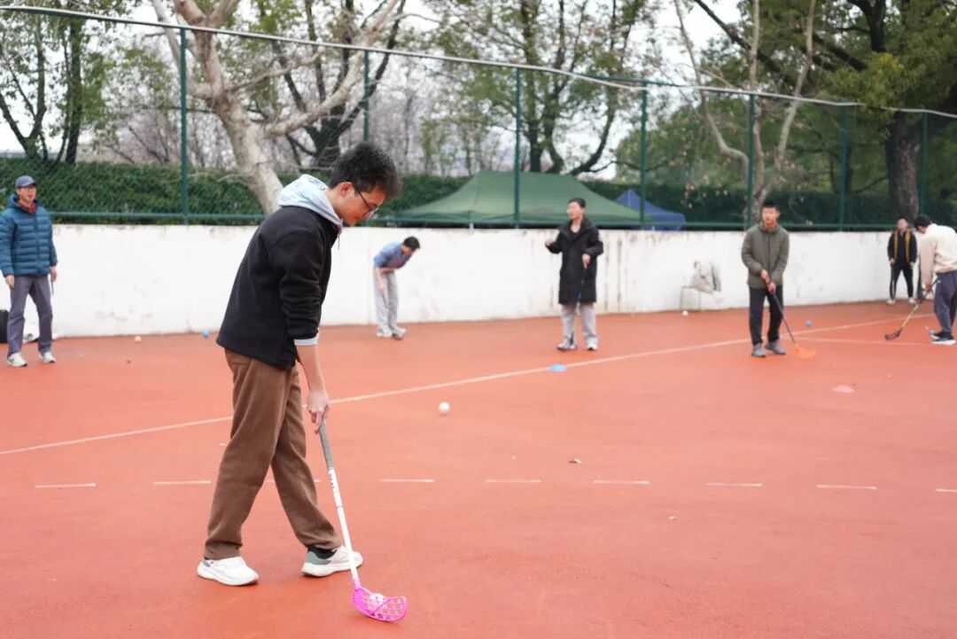 “它规则有点像足球,就是用轻质碳纤维球杆击打镂空塑料球,将球射入对方球门得分。”授课教师姚志强介绍,这项运动安全性高、场地适应性强,草地、沙地、光滑水泥地……哪里都能玩。